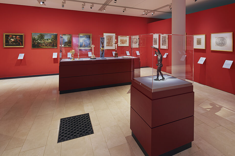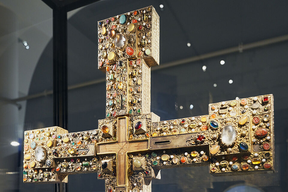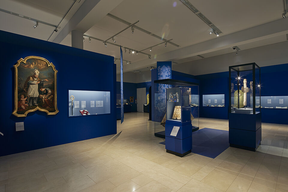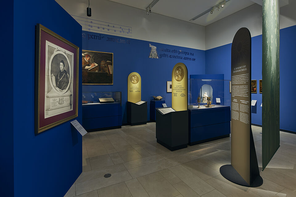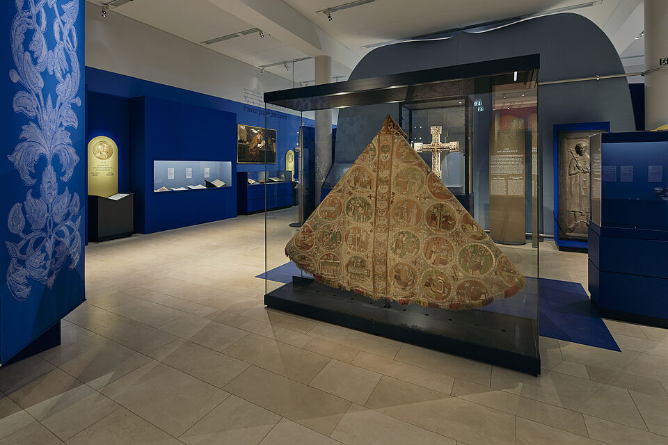 Beeindruckend ist die Kuppel der Klosteranlage in St. Blasien. So gestaltete Raumeinsichten den Eingangsbereich mit diesem Motiv. Ein raumfüllender Textildruck ist auf eine aufwändig gestaltete Rahmenkonstruktion gespannt. Die wertvollen Objekte wurden ansprechend präsentiert und geschützt.