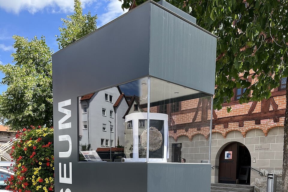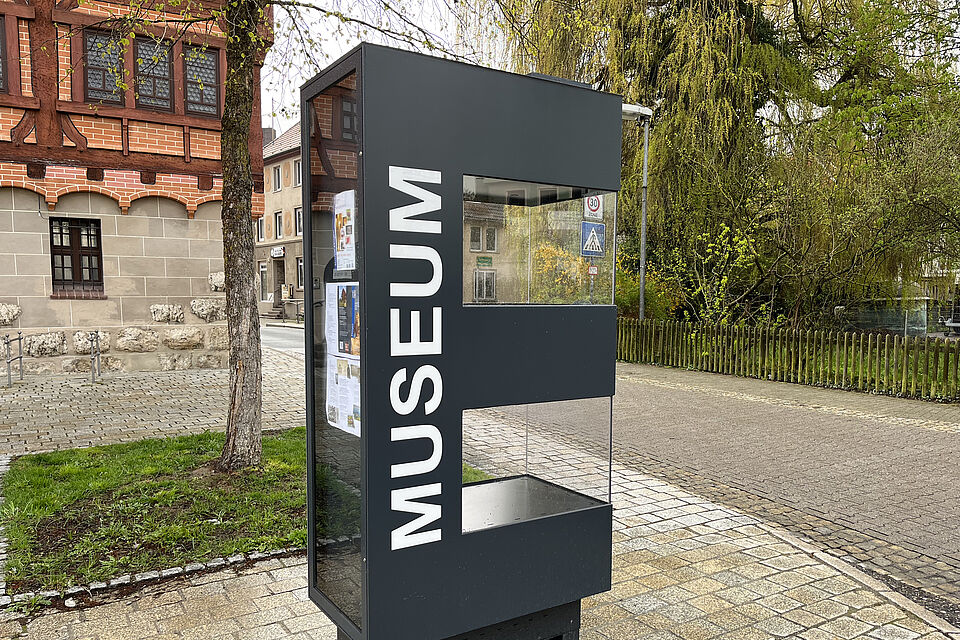 Das wunderschöne Gebäude des Stadtmuseum in Ehingen wurde oft nicht als Museum erkannt. Eine große Beschriftung am Gebäude wurde vom Denkmalschutz nicht genehmigt. Aus dieser Vorgabe entwickelte Raumeinsichten zusammen mit der Stadt eine prominent platzierte Stele in der Form eines „E“. Die Zwischenräume im Buchstaben werden als Vitrinenräume genutzt und sind beleuchtet. Die Stirnseite kann für Plakatierungen genutzt werden.