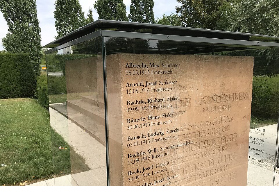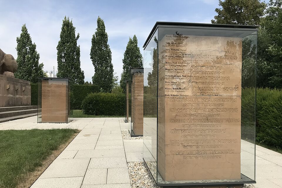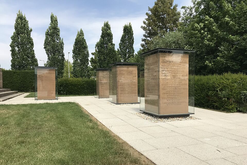 Um die Schriften in den quaderförmigen Stelen zu schützen und wieder lesbar zu machen, wurde Raumeinsichten gebeten, sich ein Konzept hierfür zu überlegen. Vandalismus resistente VSG – Scheiben wurden in die ausgeklügelt belüftete Metallkonstruktion eingesetzt. Die bedruckte Folie sitzt zwischen den Scheiben.
